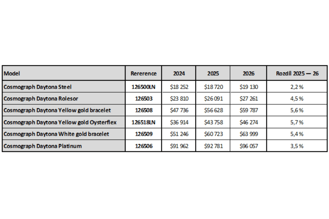Změna cen Rolex (2024 až 2026) – primární trh (zdroj: monochrome-watches.com)