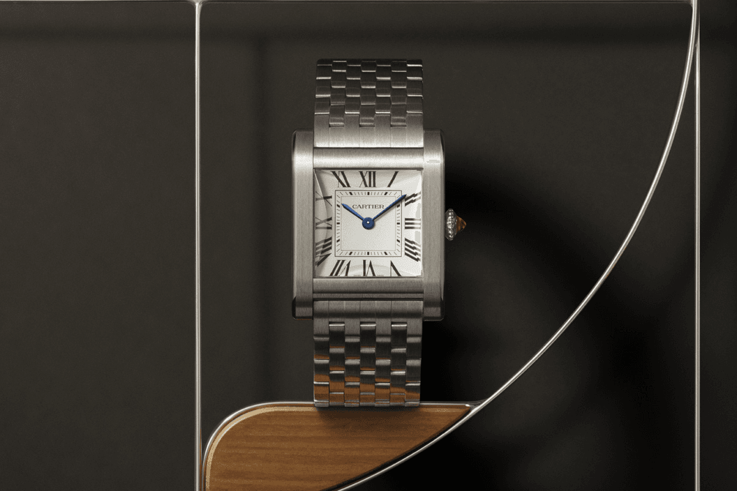 Kombinace charakteristického kovu tohoto hodinářského domu, platiny, s vínovým řemínkem je odkazem na ikonický rubínový kabošon, který se tradičně nachází na platinových hodinkách Cartier.