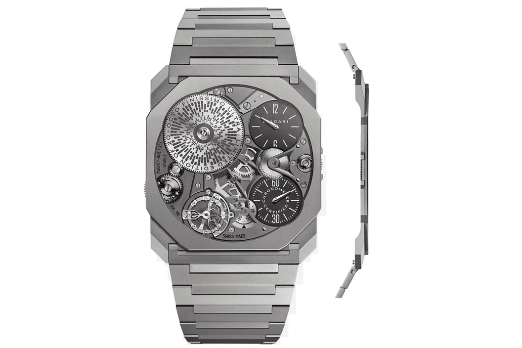 Bvlgari šel svou vlastní cestou, posunul hranice ergonomie vytvořením nejtenčích náramkových hodinek s tourbillonem. Asi není třeba říkat více než to, že sklo, ručky, číselník, tourbillon a dýnko vtěsnali do celkové tloušťky 1,7 mm.