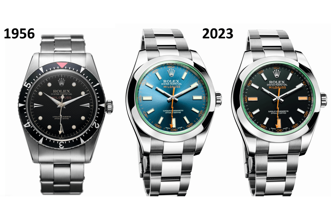 První Milgauss (vlevo) a poslední provedení modelu (uprostřed a vpravo) (zdroj: Rolex)