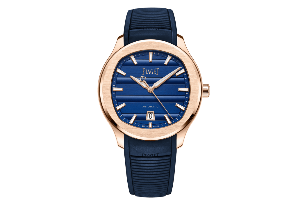 Piaget Polo Signature Date, 42 mm. Pouzdro z 18K růžového zlata. Modrý číselník s datumovým okénkem, indexy a ručky z 18K růžového zlata se SuperLumiNova®. Vyměnitelný tmavě modrý pryžový řemínek. Safírové dýnko. Manufakturní mechanický kalibr 1110P s automatickým nátahem.