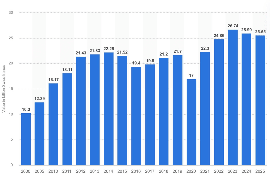 Hodnota exportu švýcarských hodinek v letech 2000–2025; (zdroj: Federation of the Swiss Watch Industry via Statista)