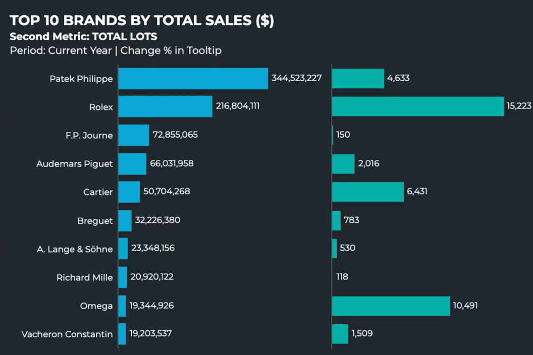 Top 10 značek podle celkového objemu prodejů a počtu prodaných kusů na aukcích za rok 2025 v USD; (zdroj: Everywatch)