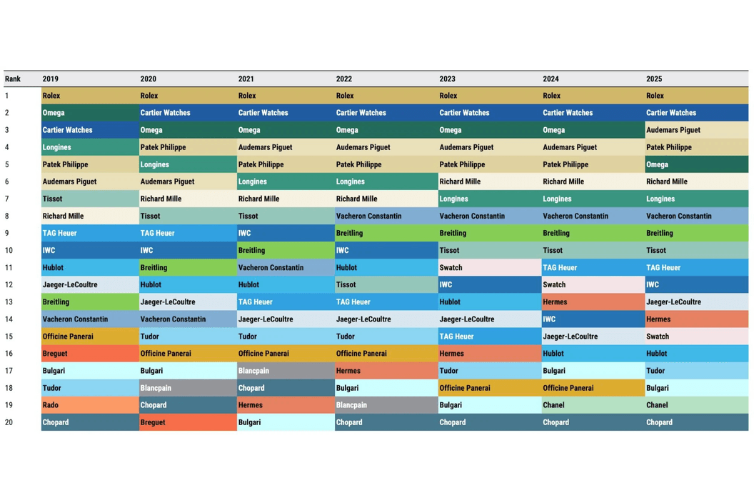 Pořadí 20 největších švýcarských hodinářských značek podle obratu od roku 2019; (zdroj: Morgan Stanley Research a LuxeConsult)