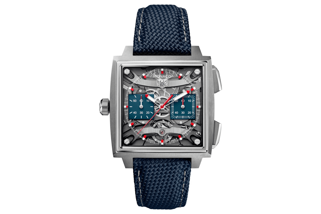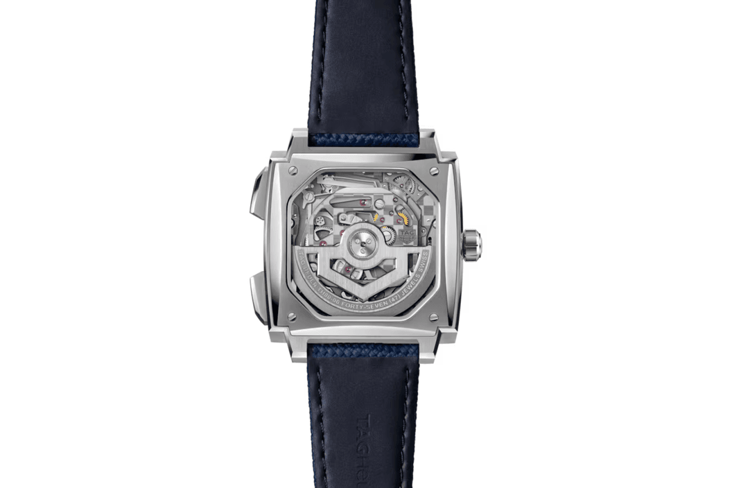 TAG Heuer Monaco Evergraph proměňuje mechaniku v design. Průhledný číselník odhaluje hranatou geometrii kalibru a obrácenou konstrukci, s pérovníkem a oscilátorem viditelnými ze strany ciferníku, zatímco dva velké oblouky, které tyto prvky nesou, vytvářejí strukturu a hloubku.