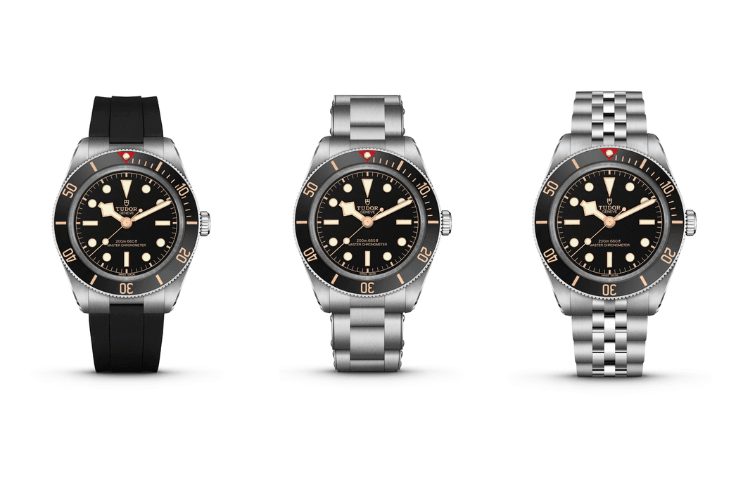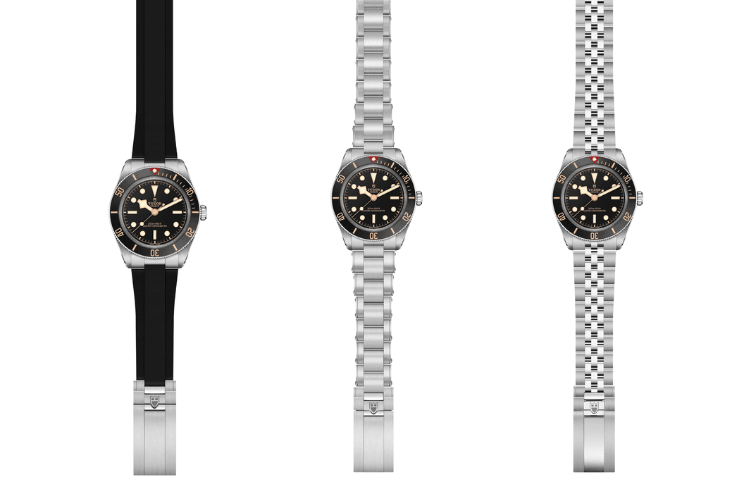 - Volba mezi pětičlánkovým tahem z nerezové oceli, tříčlánkovým „rivet-style“ tahem z nerezové oceli nebo pryžovým řemínkem, vše se sponou TUDOR „T-fit“ s rychlým nastavením