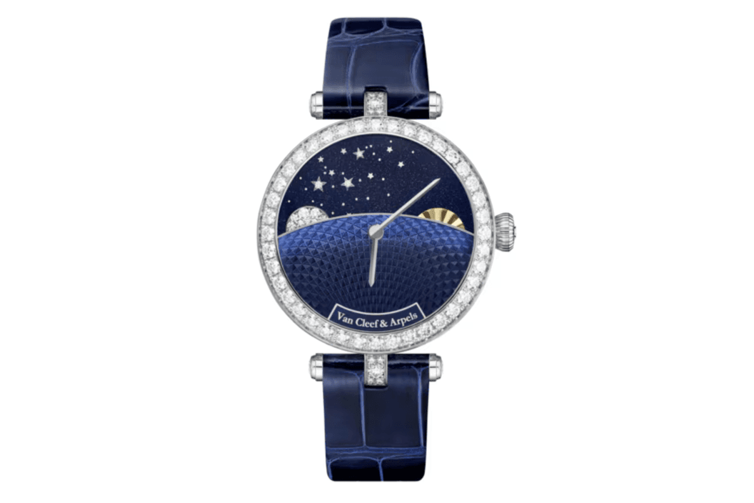 Kolekce Poetic Complications, hodinky Lady Jour Nuit. Pouzdro z 18K bílého zlata s rhodiovanou povrchovou úpravou, 33 mm, kulaté diamanty; luneta z 18K bílého zlata s rhodiovanou povrchovou úpravou, kulaté diamanty; číselník z modrého aventurinového skla, bílé a žluté zlato, kulaté diamanty; guillochovaný kryt z bílé perleti lakované namodro; korunka z 18K bílého zlata s rhodiovanou povrchovou úpravou, kulaté diamanty; lesklý modrý vyměnitelný řemínek VCA z aligátoří kůže; vyměnitelná trnová spona z 18K bílého zlata s rhodiovanou povrchovou úpravou, kulaté diamanty; diamanty kvality DEF, IF až VVS; mechanický kalibr s automatickým nátahem (Valfleurier) vybavený 24hodinovým modulem, 36hodinová rezerva chodu; číslovaná edice. Hodinky se prodávají s druhým výměnným řemínkem zdarma, který si lze zvolit při nákupu.
