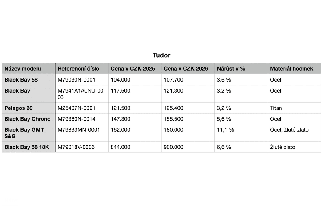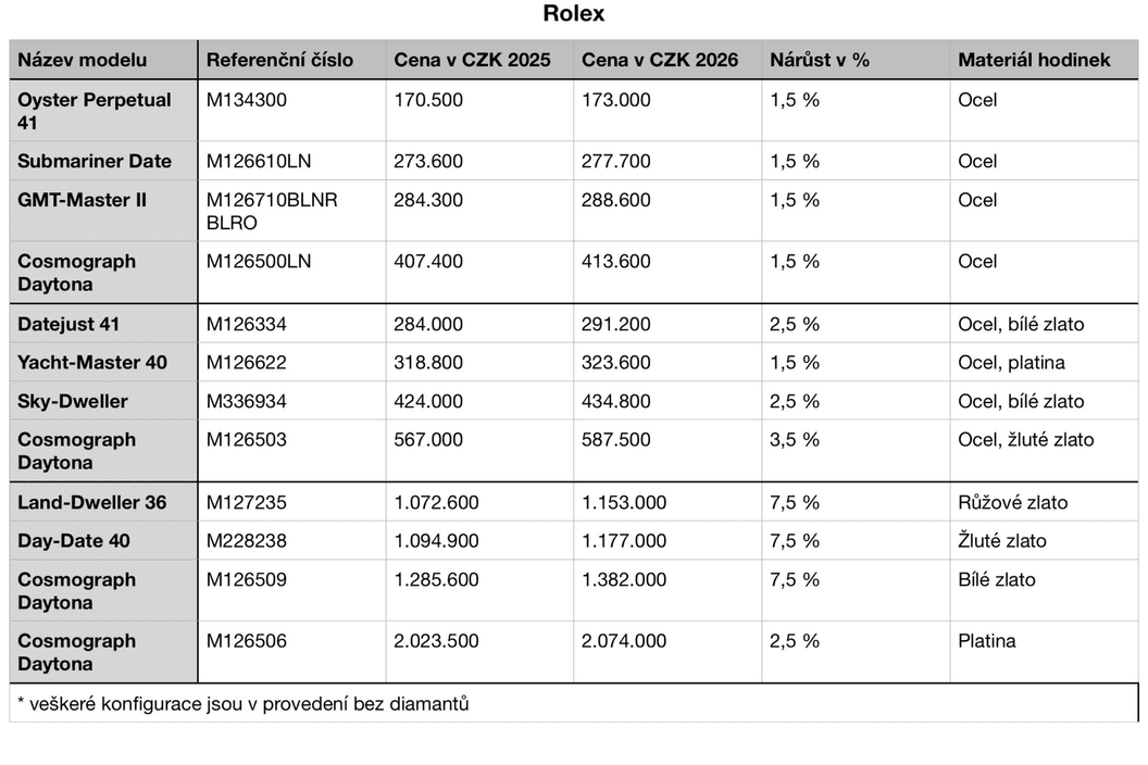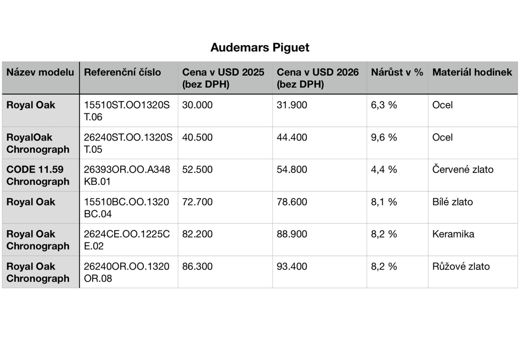Kontext z roku 2025 ukazuje, že zdražování není jen otázkou materiálů, ale i geopolitiky a obchodních bariér. Některé značky v průběhu roku upravovaly ceny i dvakrát, mimo jiné kvůli vyšším clům na vývoz ze Švýcarska do USA. Rolex tak od 1. května zdražil v průměru o 3 % a Omega krátce nato přibližně o 5 %. U celozlatých modelů se v některých případech zdražení vyšplhalo až do dvouciferných hodnot, což znamenalo nárůst o desítky tisíc korun během jediného roku. Patek Philippe navíc v roce 2025 na americkém trhu kumulativně navýšil ceny celkem o výrazných 22,4 %. Na začátku roku 2026 zvedla ceny mimo Rolex a Tudor (v průměru o 3,3 % celosvětově a 1 % v ČR) také značka Audemars Piguet (v průměru o 7,5 % pro USA a 2,5 % pro VB) a TAG Heuer (v ČR dle kolekce v rozmezí 3–8 %).