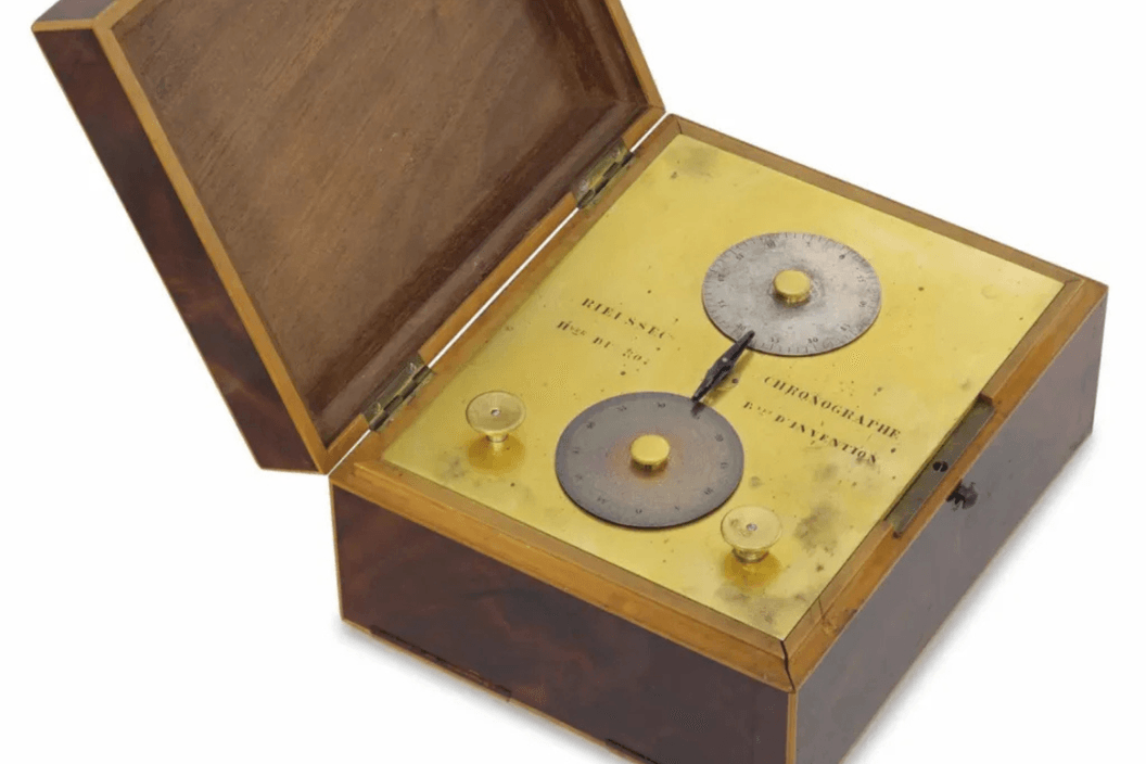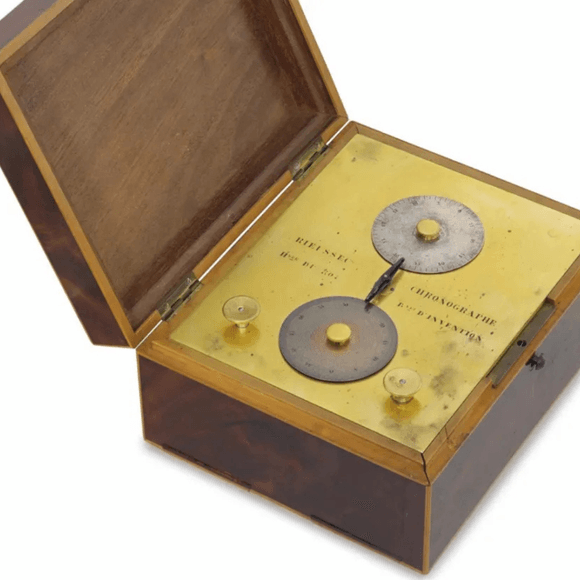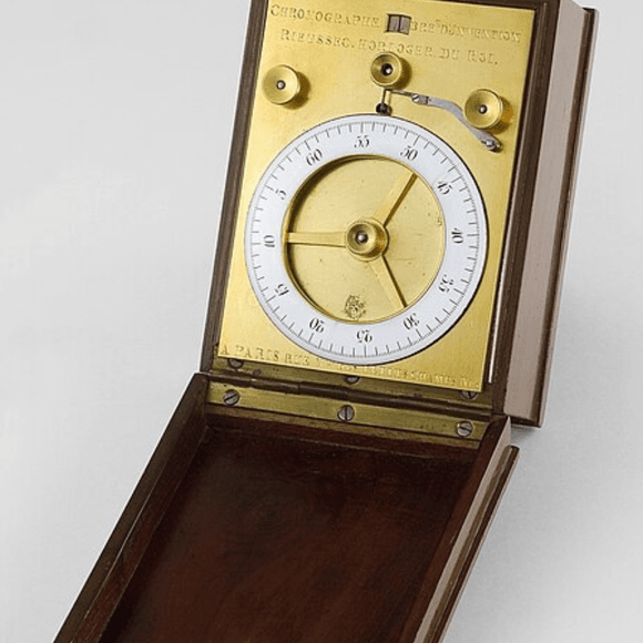 První komerčně využívaný chronograf vytvořil v roce 1821 dvorní hodinář Ludvíka XVIII. a francouzský vynálezce Nicolas Mathieu Rieussec. Jeho konstrukce zahrnovala otáčející se disk s inkoustovým hrotem, který se otáčel při spuštění a zanechával stopu na pevném podkladu, čímž byl ideální pro měření koňských dostihů. Přesnost byla na desetinu sekundy. Právě Rieussec dal svému přístroji jméno chronograf, tedy v doslovném překladu „psač času“.