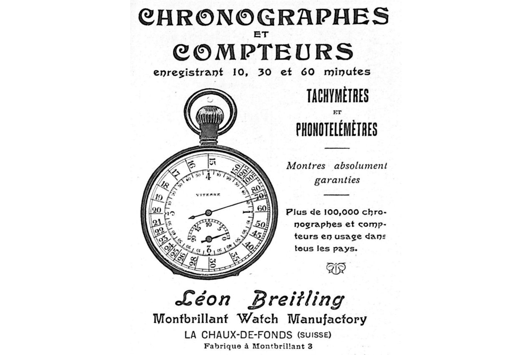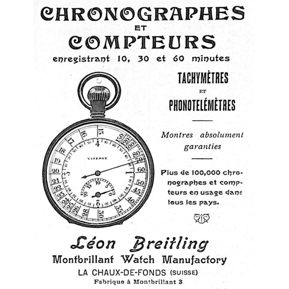 Ve 30. letech dostaly hodinky s chronografem tachymetrickou stupnici, která sloužila k měření průměrné rychlosti na závodech tehdejší Grand Prix, dnes Formule 1. Průkopnickými značkami byly kromě Breitlingu zejména Longines nebo Heuer. V roce 1934 patentoval Willy Breitling první chronograf se dvěma tlačítky, kdy ono nové druhé sloužilo k vynulování ručičky. Tento princip se používá dodnes.